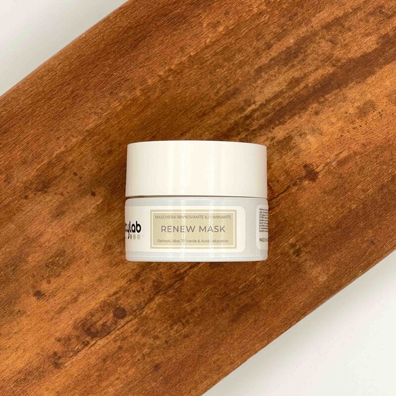 “RENEW MASK” è la maschera viso per la notte con proprietà illuminanti grazie al suo contenuto di Retinolo ed un complesso illuminante da Curcuma e Amido di Riso. Arricchiscono la formula il Caolino setificante, l'Acido Ialuronico, il Tè Verde, l'Equiseto e la Calendula con proprietà idratanti e lenitive.